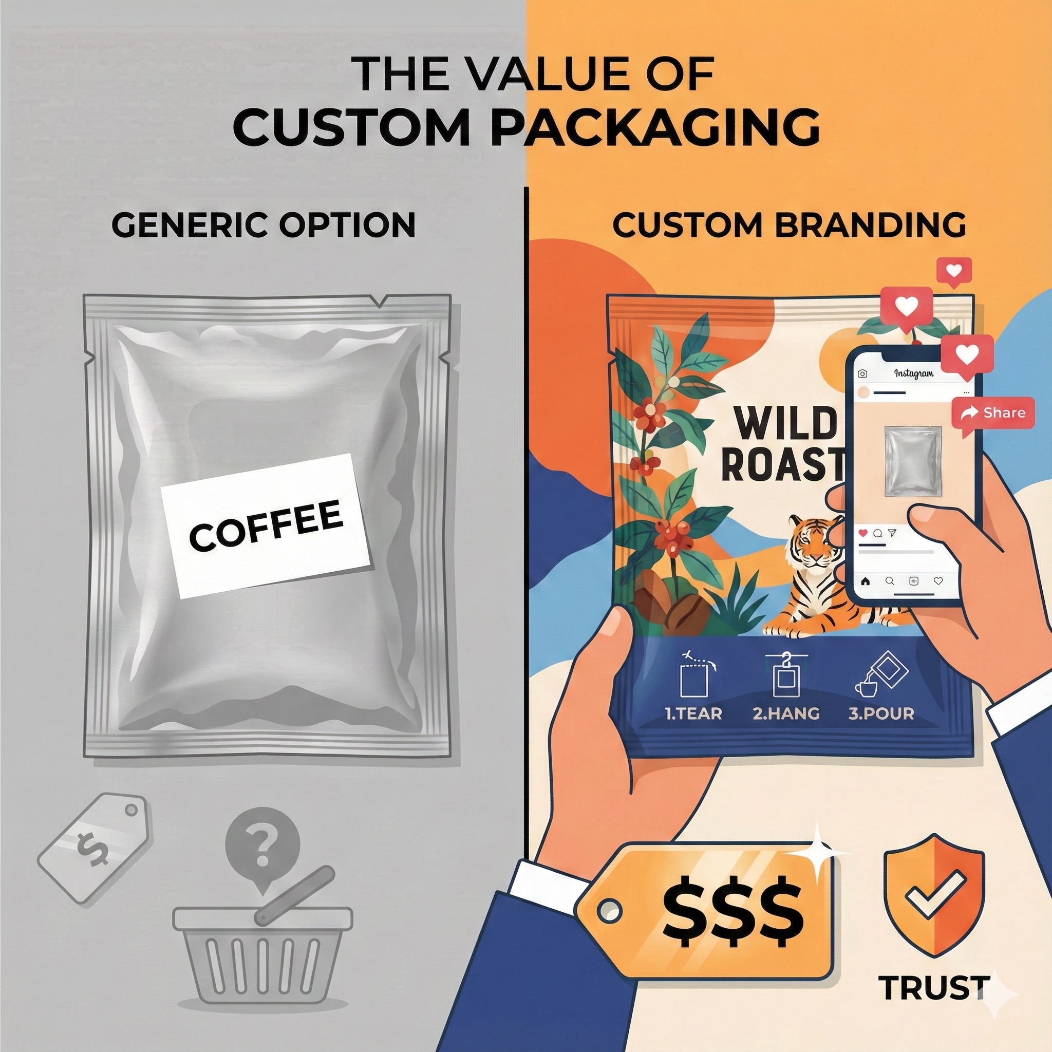 For specialty coffee roasters, the coffee inside the bag is a work of art. But for this work of art to sell well, the packaging must also match the quality of the coffee itself. While using generic “common” packaging is a low-cost way to get started, for most growing brands, transitioning to custom-printed drip coffee bags is the real turning point.