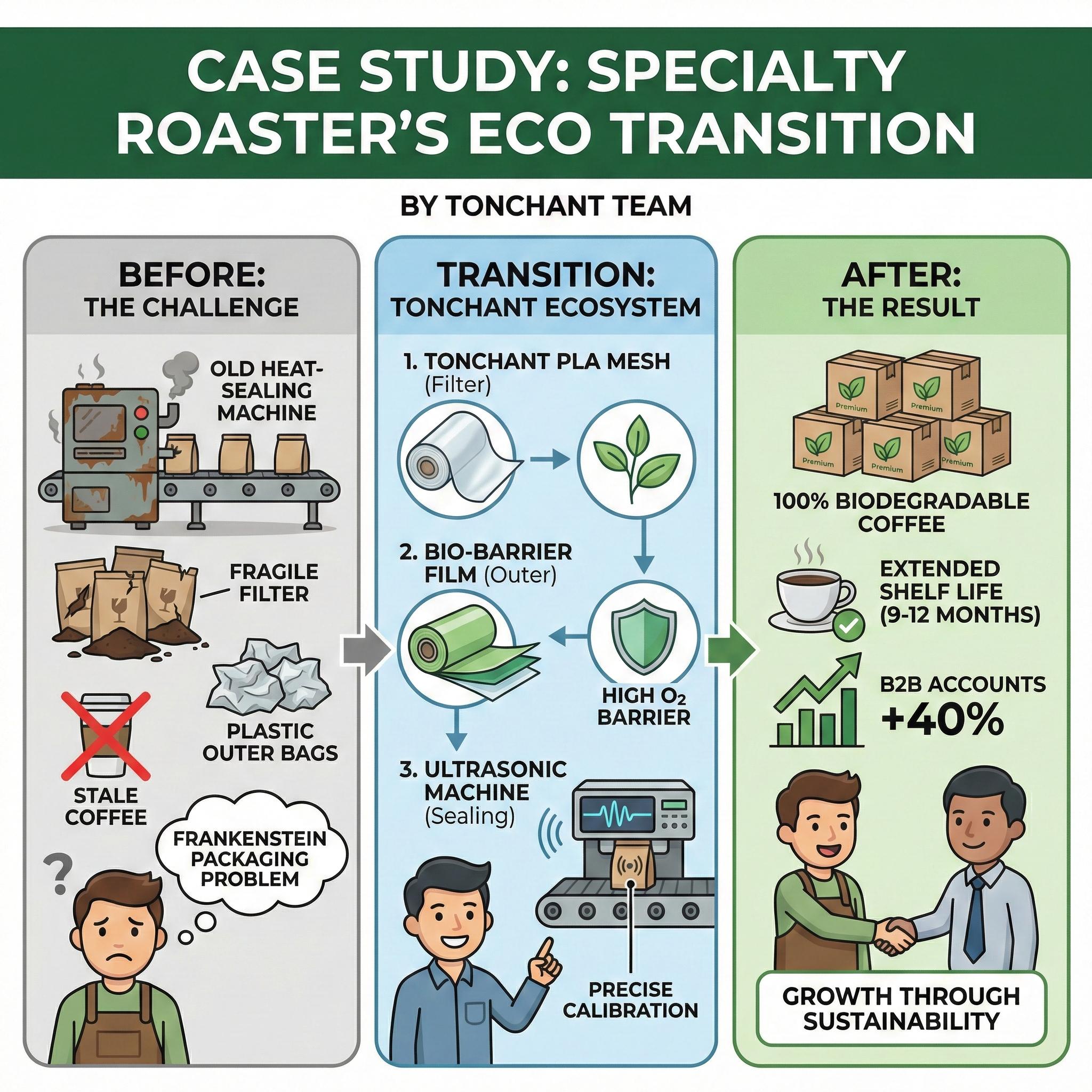 You can’t use old-fashioned, high-temperature heat-sealing machines to handle sensitive biological materials. Since they were already upgrading their production capacity, the roaster invested in a Tonchant Fully Automatic Drip Coffee Packaging Machine. We equipped the machine with Ultrasonic Sealing Technology. Instead of using heat to melt the PLA mesh, the machine utilizes high-frequency sound waves to instantly fuse the edges. This eliminates tearing issues and allows the machine to operate smoothly at high speeds without causing thermal damage to the eco-friendly film.