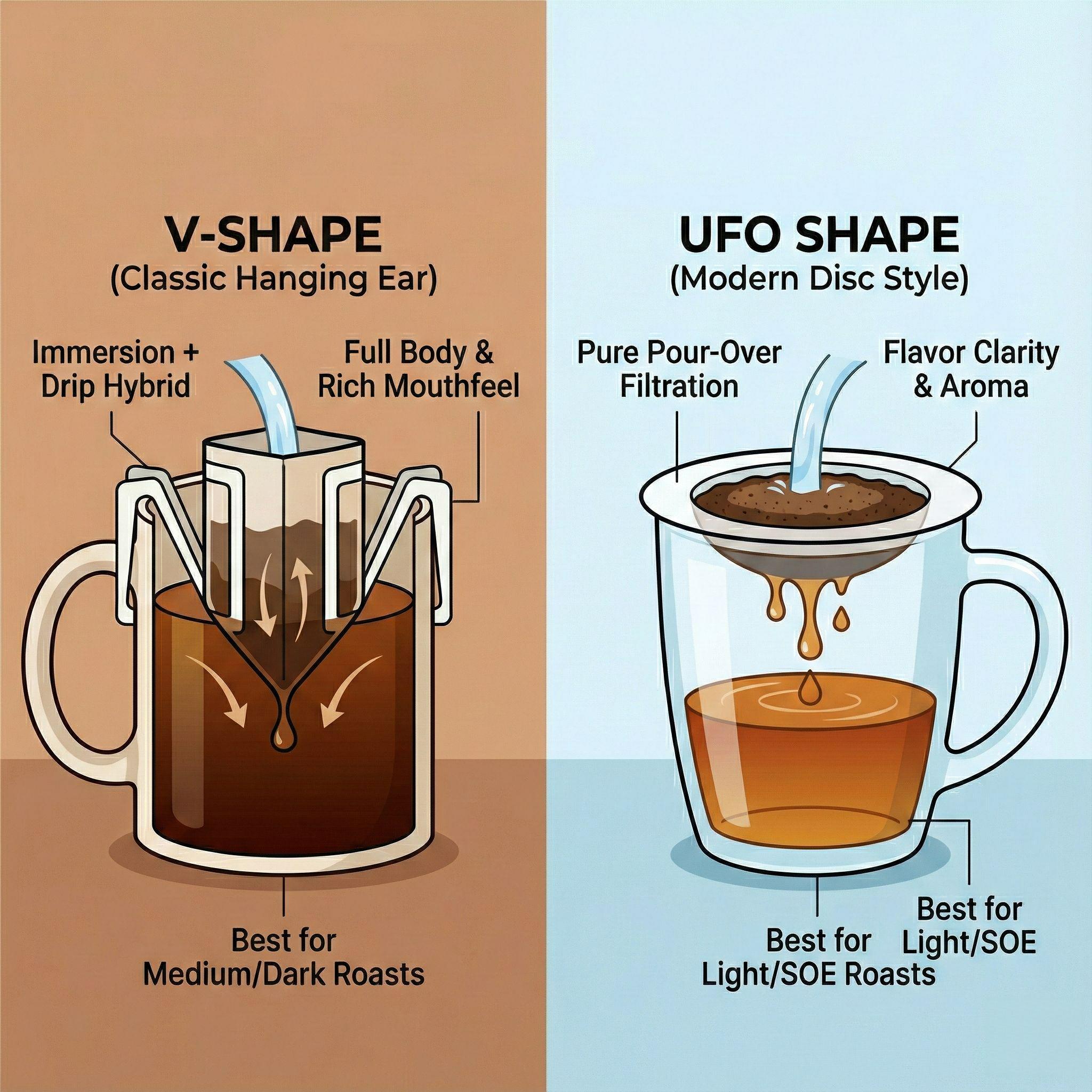 V-Shape: Best for standard-sized mugs. If the cup is too wide, the ears may slip; if too tall, the bag may not reach the water for immersion.