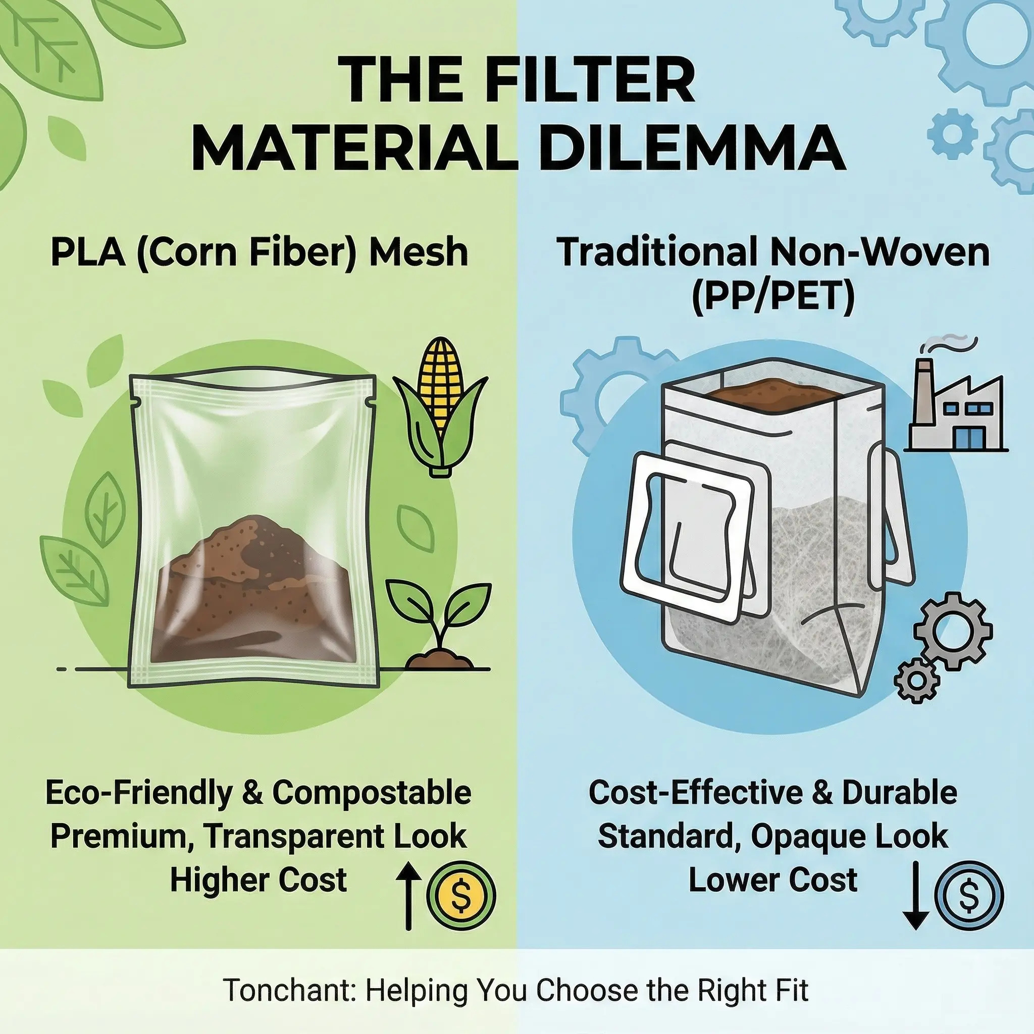 For specialty roasters and tea brands, choosing the right filter material is no longer just a supply chain decision, but a brand-building decision. At Tonchant, we receive inquiries daily about the differences between our standard nonwoven filters and our new PLA filters.