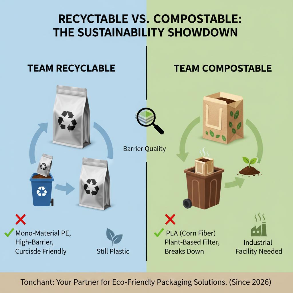 Tonchant manufactures both materials. We supply PLA corn fiber (compostable) and high-barrier single-layer PE (recyclable) roll film and bags. Our commitment to neutrality allows us to provide you with an objective comparative analysis.